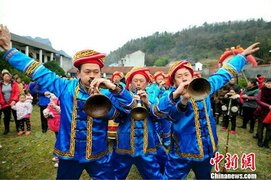連日來,三峽庫區湖北秭歸縣非遺傳承人在當地表演民間吹打樂楊林堂鼓,吸引了眾多游客關注。楊林堂鼓是生活在巴楚交界深山中民眾的“音樂食糧”,被列入湖北省非物質文化遺產名錄。楊林堂鼓多取材于當地人們的田野勞作以及鄉間民俗等,堂鼓樂隊共有12人,其樂器主要有大小堂鼓、大小鑼、小镲以及嗩吶和長號,演奏內容豐富,演奏形式多樣,坐奏、行奏、獨奏、合奏不拘一格,一支嗩吶多人奏,多支嗩吶一人奏,變幻如行云流水,出神入化。這些絕技把古代宮廷儀式音樂與民間吹打樂有機結合,猶如深山里的天籟之音,展現了當地人們祈福豐收、憧憬美好生活的淳樸心愿。