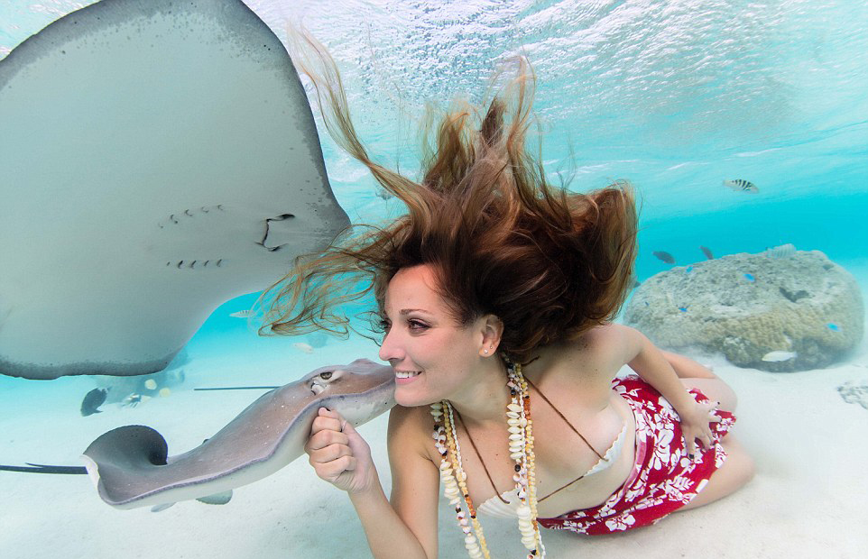 比基尼美女與致命黃貂魚親密共泳