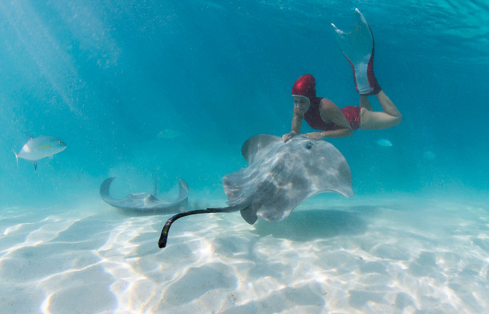比基尼美女與致命黃貂魚親密共泳