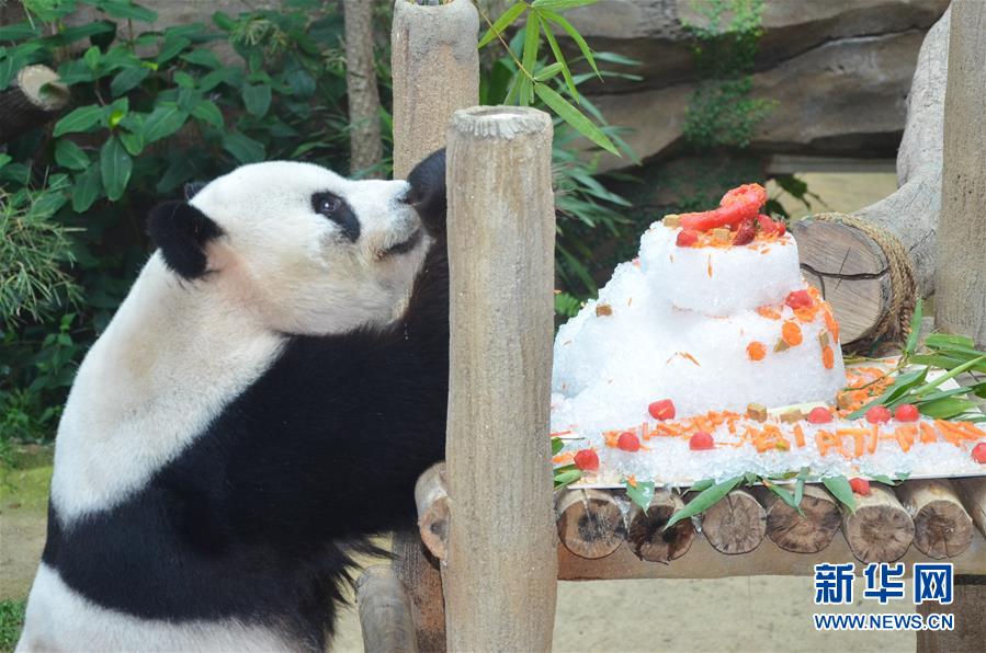2015年9月3日,在馬來(lái)西亞首都吉隆坡,大熊貓“興興”在享用生日冰蛋糕。新華社發(fā)(王大瑋攝)(張加揚(yáng)編輯)