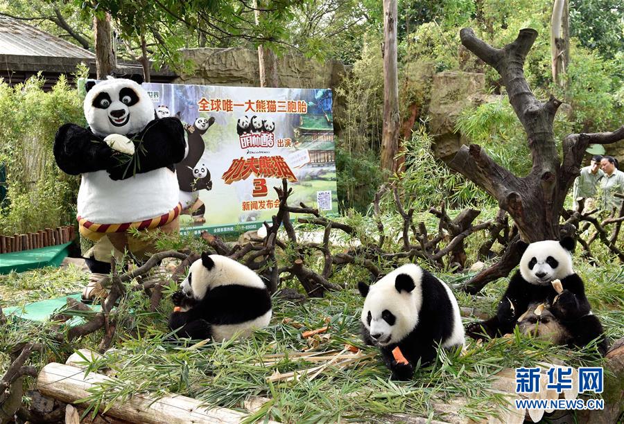 2015年11月26日,在廣州長隆野生動物世界,“功夫熊貓阿寶”在與大熊貓三胞胎互動。由美國夢工廠、東方夢工廠和中影股份聯合制作的動畫喜劇電影《功夫熊貓3》將于2016年1月29日在中國內地上映,該片特別融入了全球唯一三胞胎大熊貓——長隆三胞胎大熊貓的形象。新華社記者劉大偉攝(張加揚編輯)