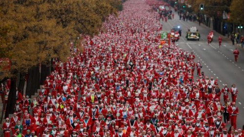 奔跑吧,圣誕老人!西班牙首都馬德里近日舉行第4屆圣誕老人賽跑,逾1萬人打扮成圣誕老人參加,打破去年5173人的吉尼斯世界紀錄。比賽隊伍沿著西甲球隊皇家馬德里主場班拿貝球場的街道跑5.5公里,場面十分壯觀。本次比賽每人參賽費用為12歐元,所有收益捐贈多發性硬化癥基金會。