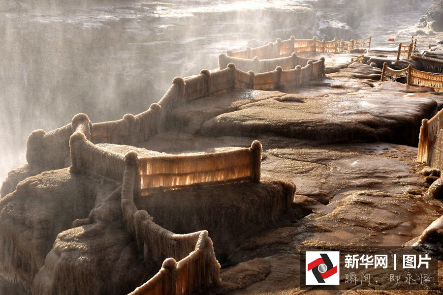 近日,受降溫天氣影響,黃河中游晉陜峽谷氣溫下降至零下十度以下,壺口瀑布滴水成冰,從瀑布腳下飛濺起來的浪花和彌天水霧在兩岸的巖石和護欄上凝結形成冰掛景觀,與瀑布上空飛舞的彩虹相映成輝,美不勝收。