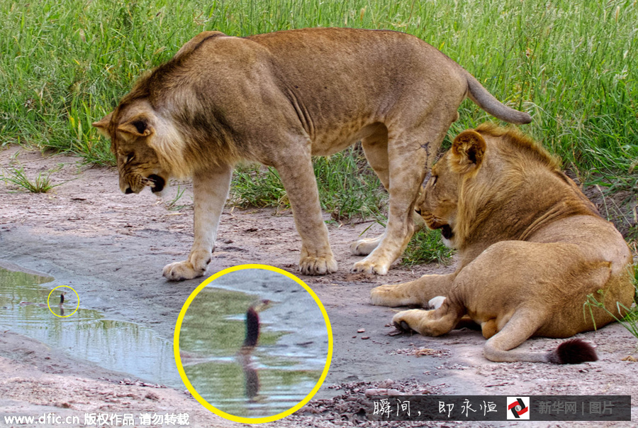 在博茨瓦納Savuti Game保護區,這兩頭“叢林之王”可能更像是兩只小貓,因為它們竟然被小水坑里的一條極小的蛇寶寶給嚇著了。兩頭獅子在一小水坑里發現了一條小蛇,它們誰都不敢靠近,而是輪流試探性接近這條小蛇。幾分鐘后,其中有一頭獅子終于鼓起勇氣上前去一探究竟。膽小的獅子還朝著小蛇咆哮,然后又用爪子試圖嚇走這條小蛇,看上去讓人忍俊不禁。(來源:東方IC)