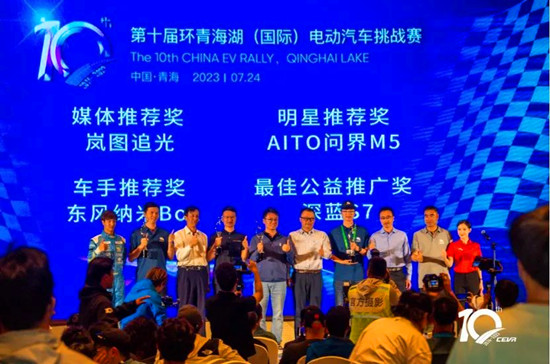 媒體推薦獎由嵐圖追光獲得,贏下明星推薦獎的是AITO問界M5,車手推薦獎得主為東風納米BOX,最佳公益獎則由深藍S7收入了囊中。頒獎嘉賓鄧曉文雖是“90后”,卻是唯一一位參與十屆賽事的官方車手,他說:“很榮幸,這十年我都在!”作為一名參加了十年環青海湖(國際)電動汽車挑戰賽的車手,他見證了中國新能源汽車的成長與發展,見證了環青海電動汽車挑戰賽的成長,“依然希望與大家相約,見證CEVR下一個十年!”