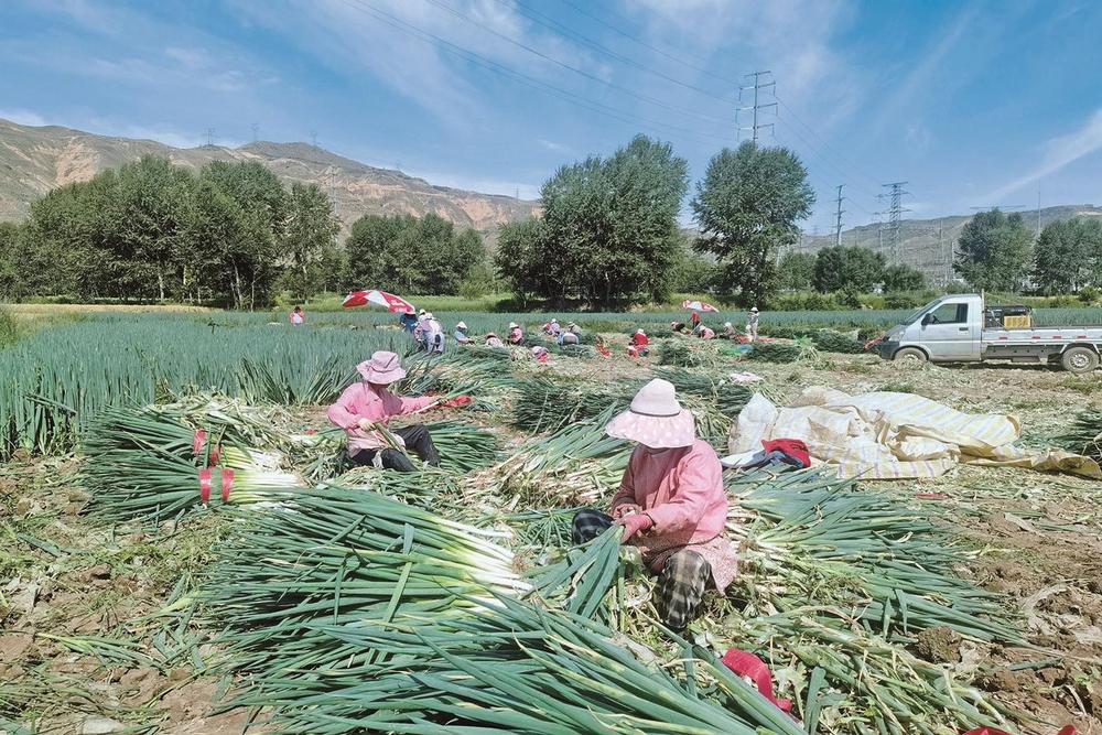 8月3日,互助縣塘川鎮陶家寨村,互助縣守前種植合作社負責人正在組織農民工采挖大蔥,地里連片種植的長白蔥長勢喜人,一捆捆打包好的長白蔥整齊碼放在田間地頭,村民在忙著挖蔥、去秧、打捆。
