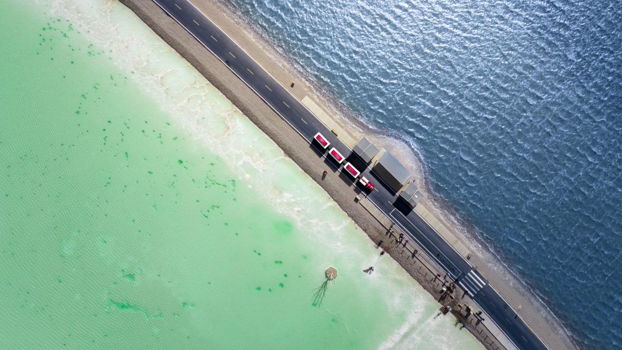 一湖雙色:由一條公路分隔開來如海水般深藍(lán)的外湖與碧綠幽靜鏡湖相應(yīng)成趣,是鹽湖景觀“公路打卡”的最佳選擇。(景區(qū)提供)