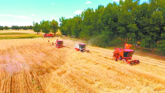 9月20日,位于海東市化隆回族自治縣沙連堡鄉的千畝(約66.7公頃)麥田里,一臺臺聯合收割機正開足馬力在麥田里來回穿梭,全力搶收,確保顆粒歸倉。陳俊 李永蘭/攝