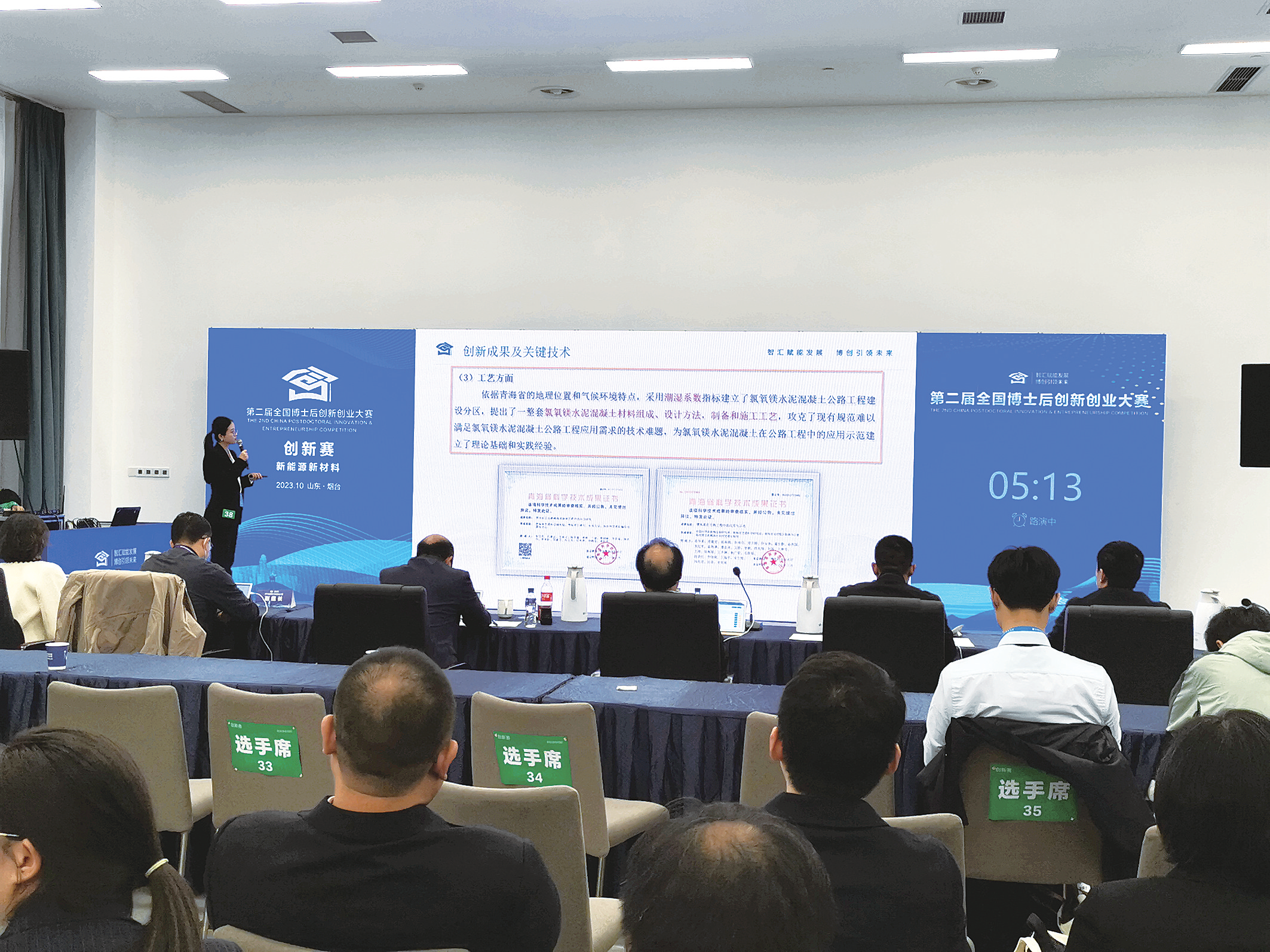 “我路演的項(xiàng)目是鹽湖化工大宗廢棄物在道路工程中循環(huán)利用關(guān)鍵技術(shù)。目前該項(xiàng)目已開發(fā)出4種復(fù)合型氯氧鎂水泥,解決了傳統(tǒng)氯氧鎂水泥強(qiáng)度過剩、耐水性不足、成本過高等制約工程推廣應(yīng)用的關(guān)鍵性問題,并且相關(guān)技術(shù)已經(jīng)應(yīng)用到了青海省的相關(guān)公路建設(shè)當(dāng)中……”來自青海省交通科學(xué)研究院的另一位博士后選手吳佳育,在新能源新材料比賽場(chǎng)上,向評(píng)委們?cè)敿?xì)闡述了自己的項(xiàng)目特點(diǎn)、優(yōu)勢(shì)。