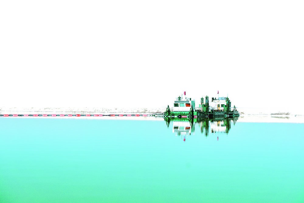 在一條由鹽堆壘起的堤岸旁,記者登上工作船,幾分鐘時間,便把我們接駁到鹽池深處正在作業的現代化采鹽船上。