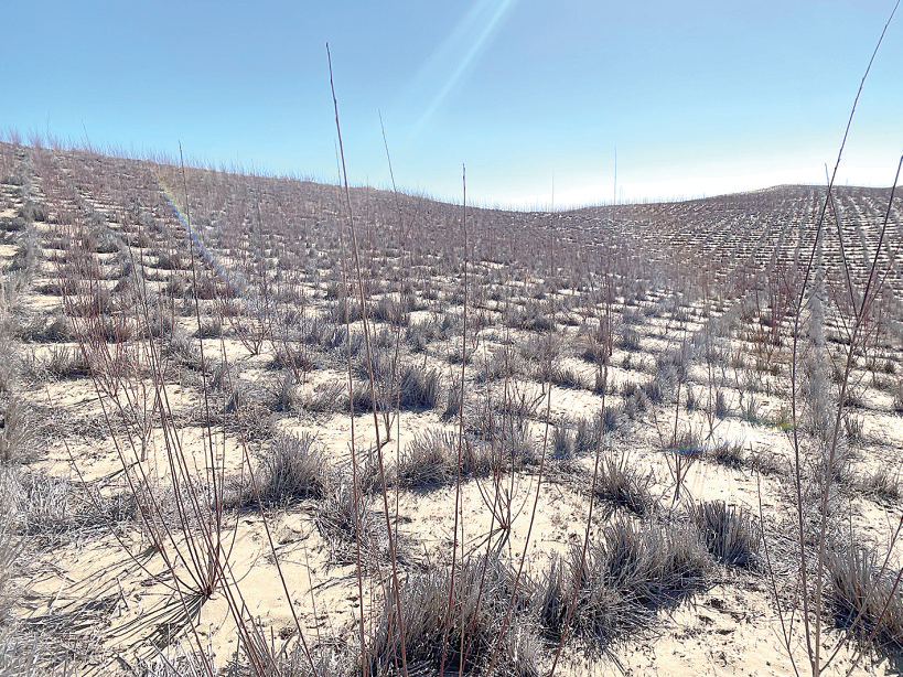 今天,沙珠玉地區(qū)的工程防治措施主要有黏土沙隙、沙蒿沙障和烏柳、檉柳柳條沙障。海南州林業(yè)和草原局局長何香龍說,如在沙丘的附近土層深厚的地方,可對沙丘設置黏土沙障固定。如果沙丘坡度較陡,而且非常高大,就應當選擇草方格沙障、沙蒿沙障或柳條沙障。設置沙障的原則是效益優(yōu)先、就地取材、投資少、見效快。因此要根據(jù)實際情況進行綜合效益分析比較,選擇沙障模式。