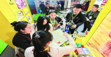 項青本和旦達爾向顧客介紹自家特色產品。譚梅/攝