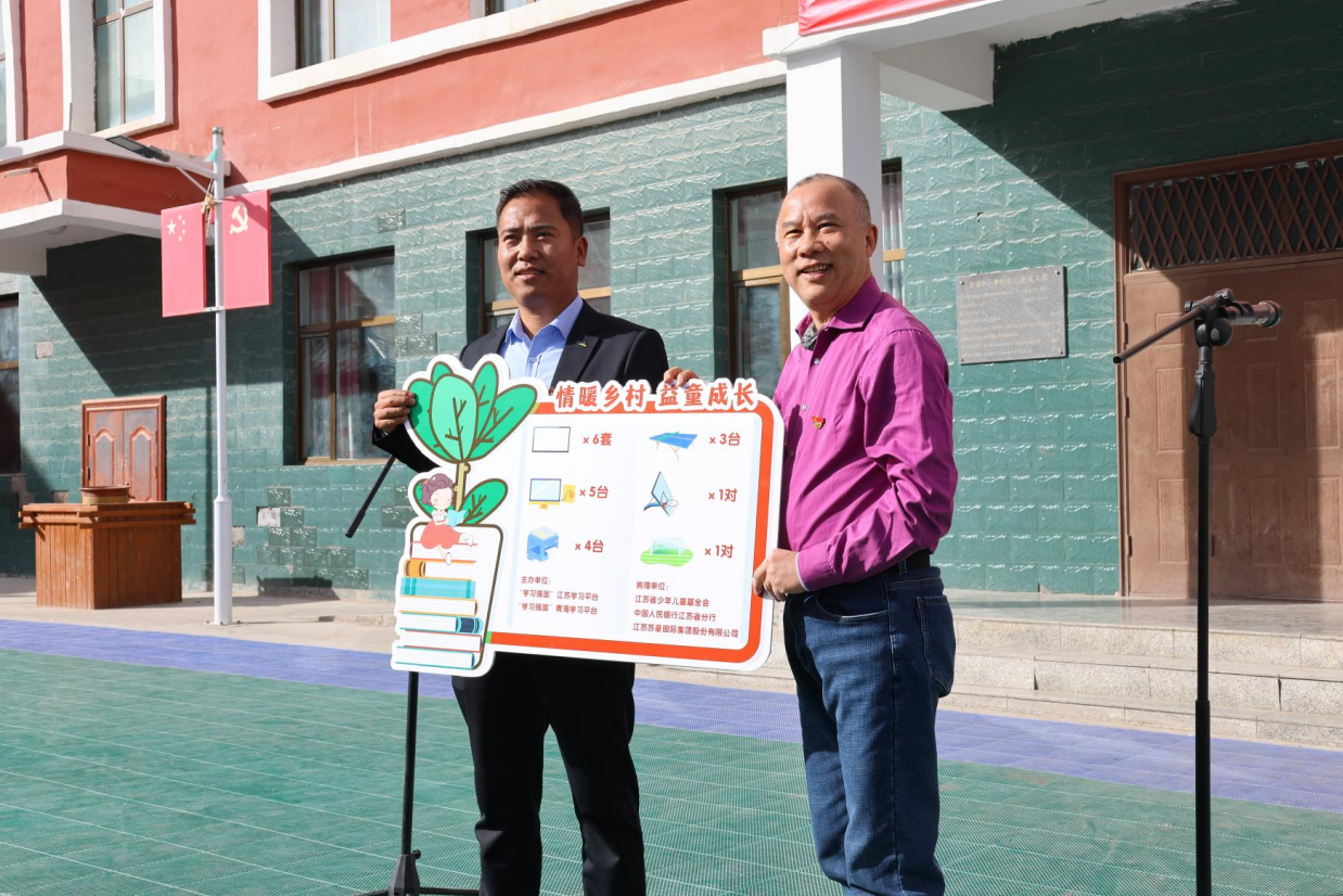江蘇蘇豪國際集團股份有限公司黨委副書記張培根、尕楞鄉中心小學校長多吉才讓捐贈交接。趙晶 攝