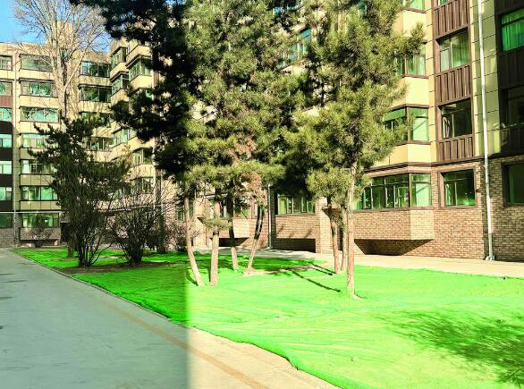 社區(qū)工作人員正在小區(qū)內(nèi)鋪設(shè)綠網(wǎng)。攝影:王晶