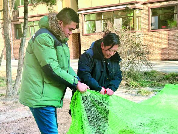 修剪綠網(wǎng)、鋪設(shè)地面……12月1日,記者來(lái)到舉報(bào)點(diǎn)位,看到現(xiàn)場(chǎng)地面干凈衛(wèi)生,五、六名南山東社區(qū)工作人員在社區(qū)黨委書(shū)記靳美虹的帶領(lǐng)下,正在對(duì)裸露的地面按塊覆蓋綠網(wǎng),利用鐵絲、石塊、木楔等工具固定綠網(wǎng)邊緣,起到抑制塵土飛揚(yáng)的作用,經(jīng)過(guò)一上午的努力,61號(hào)院內(nèi)約650平方米的閑置空地穿上了“綠衣”。