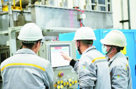 跟隨管道延伸的方向,來到干法車間,最吸引人的莫過于燒結產線上的一個個長方形小窗口。透過窗口,一個個坩堝勻速從眼前“走”過,秩序井然,沿著坩堝行進的方向,周圍的溫度隨即升高。