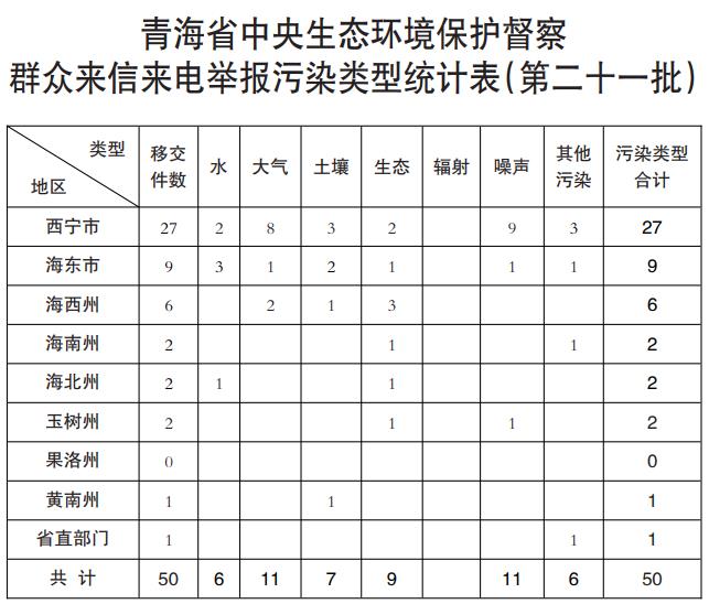 青海新聞網·大美青海客戶端訊 12月13日,中央第五生態環境保護督察組向青海省交辦了第二十一批群眾信訪舉報件共50件(來電41件,來信9件),其中交辦重點關注件5件。交辦的50件信訪舉報件涉及全省7個市州,其中西寧市27件、海東市9件、海西蒙古族藏族自治州6件、海南藏族自治州2件、海北藏族自治州2件、玉樹藏族自治州2件、黃南藏族自治州1件、省直部門1件。群眾舉報反映問題涉及噪音污染11件、生態破壞9件、大氣污染11件、水污染6件、土壤污染7件、其他污染6件。截至目前,中央第五生態環境保護督察組向我省交辦的第二十一批群眾信訪舉報件已經移交相關市州和部門,各地和相關部門正在按照程序抓緊辦理。