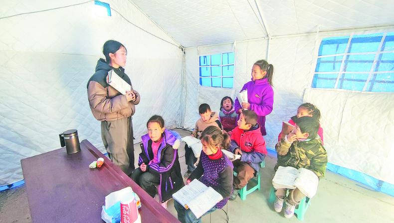 12月21日上午,海東市循化撒拉族自治縣道幃藏族鄉牙木村災后集中安置點,首個帳篷小學內傳來瑯瑯讀書聲。據悉,循化縣目前共有9所學校開展線上教學,震區其他學校將轉入正常線下教學。