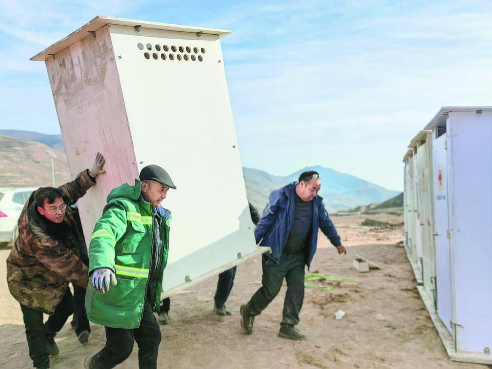 在離白家集村10公里處的曹旦麻村,卓瑪才讓穿著軍大衣和村里的黨員干部一起安裝剛拉來的移動板房。