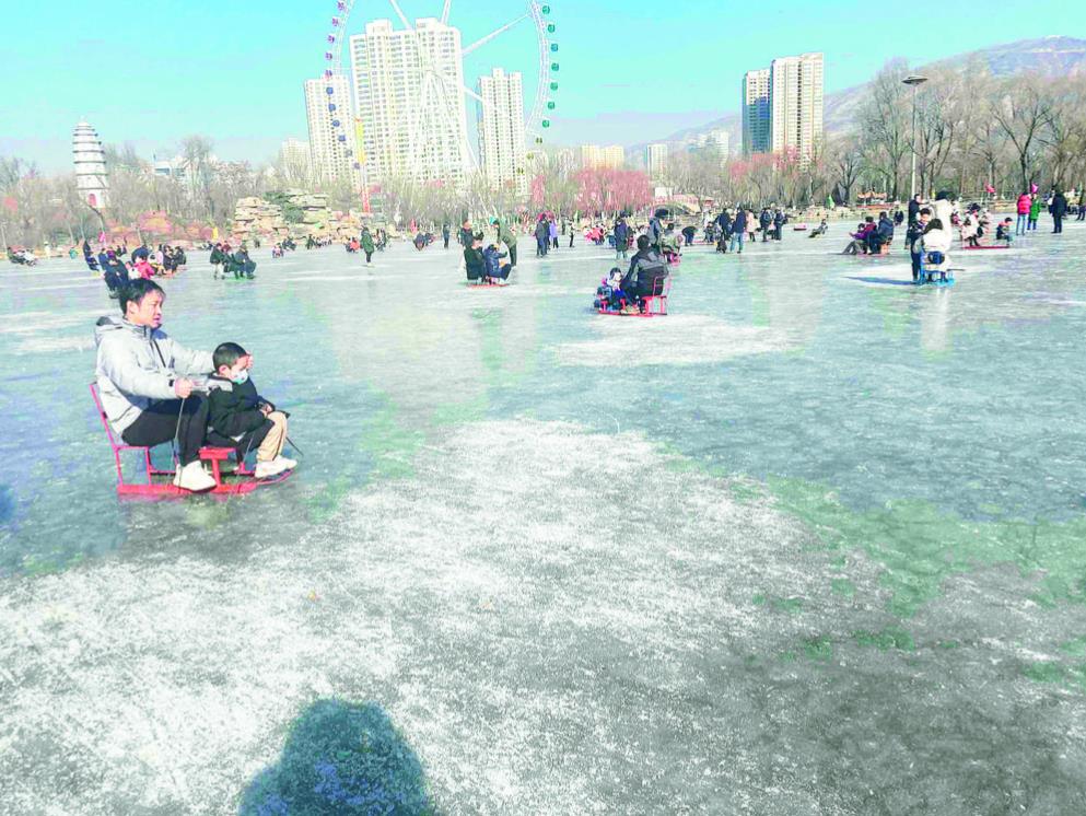 元旦假期,市民們到人民公園滑冰。董潔 攝