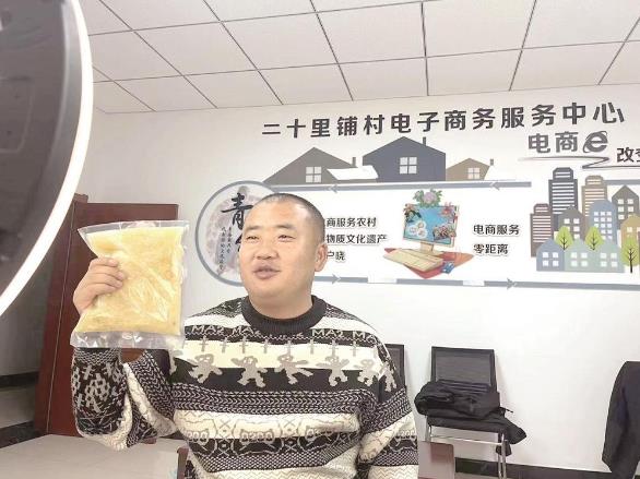 電商辦公室里,直播臺、補光燈等設備一應俱全。墻上“二十里鋪村電子商務服務中心”幾個大字格外引人注目。直播臺前,主播熱情洋溢地介紹著產品,墻上寫著的“電商改變生活,讓電商服務農村、讓非物質文化遺產家喻戶曉,電商服務零距離”,是村委會和村民們向往的目標。