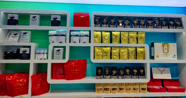 展區內,果洛知名農林畜產品和民族手工藝產品琳瑯滿目,五三六九能量塊、雪山牛肉干、福瑞祥唐卡、查謨嶺藏香、奧斯幕全脂奶粉、班瑪藏茶、冬蟲夏草等高原特色產業產品及制品進行集中展示展銷。