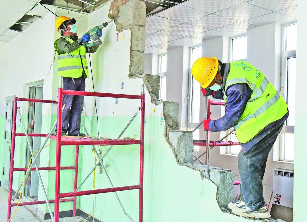 “目前,我們在11個教學點共進場67名工人進行施工,主要開展的是室內危墻拆除和砌墻恢復工作;等到氣溫回升后,我們將對室外揭除的墻皮和保溫層等進行修復,爭取能在45天內完工。”鮑家小學綜合樓加固項目和清泉幼兒園加固項目施工現場負責人張偉偉介紹說。