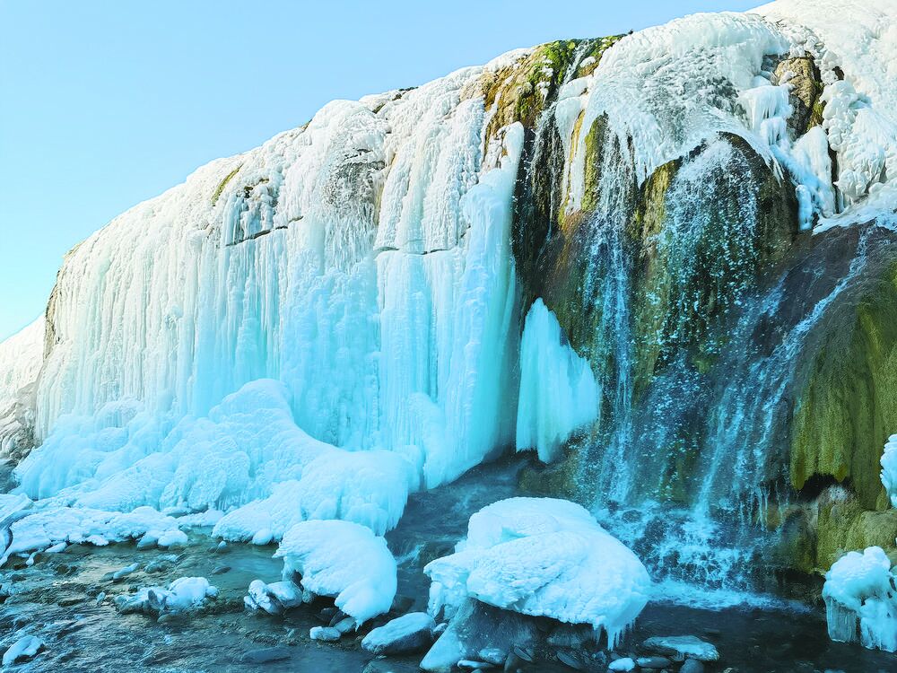 從崗什卡雪峰半山腰,繼續向前走幾十米,聞名遐邇的七彩瀑布映入眼簾。七彩冰瀑高約10米,長約200米,晶瑩剔透的冰晶之間,穿插著黃色、綠色等不同顏色的鈣化巖層,冬日暖陽下,仿佛閃動著點點彩色光芒。