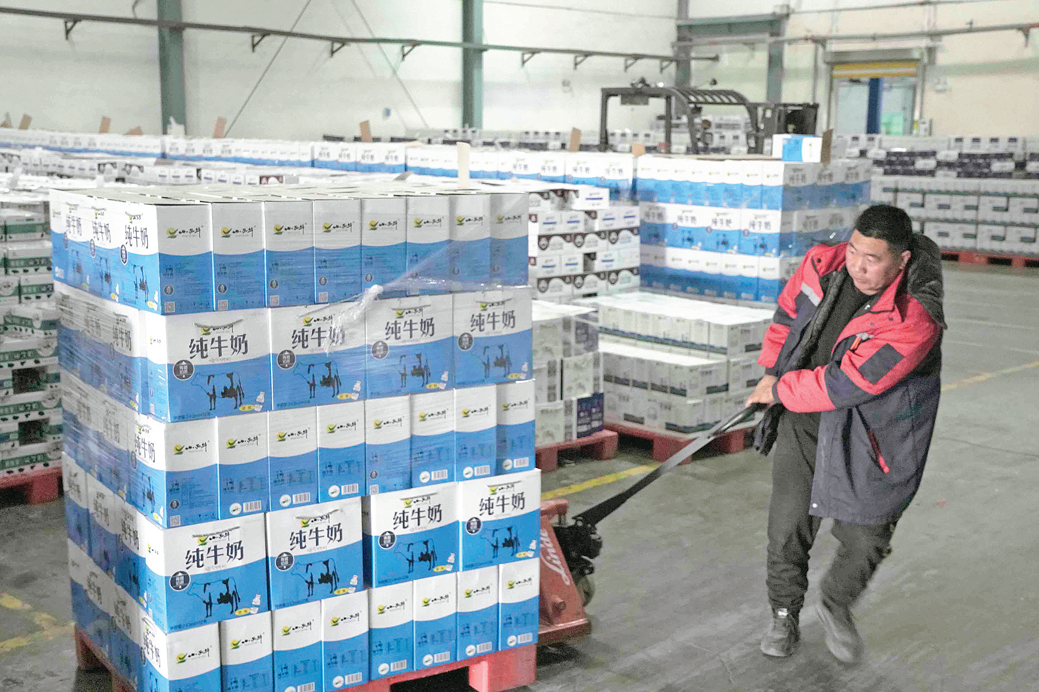 小西牛倉庫里工作人員正在搬運貨物。