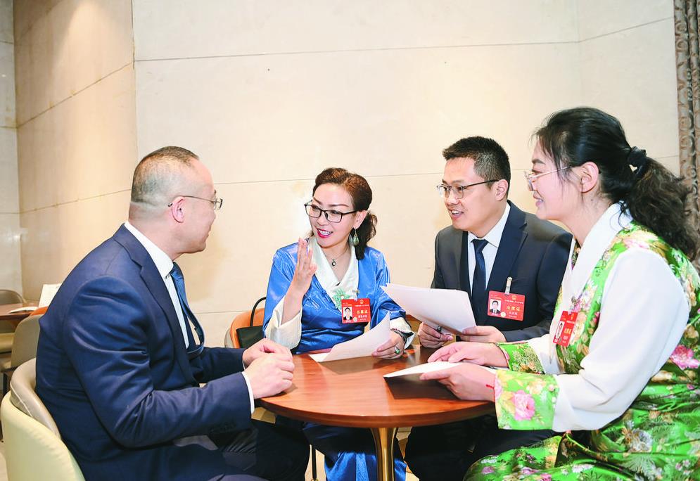 蔣志剛、夏吾卓瑪、許慶民、郭金萍代表(從左至右),就自己的建議進行交流討論。張地委 攝