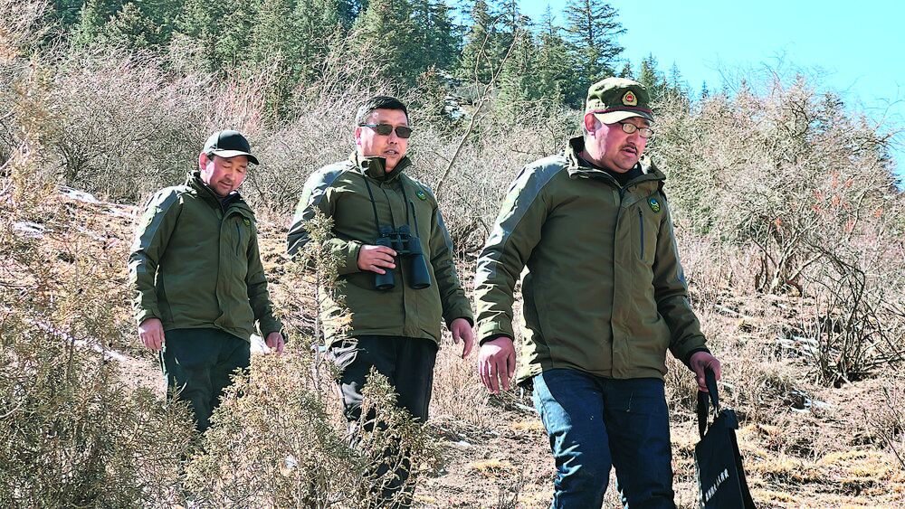 喬德才(中)和生態護林員在森林巡護。才貢加 攝