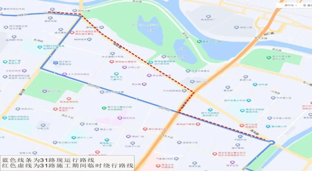 臨時取消:“人民公園”東西兩側、“鹽湖巷口”東西兩側、“交通巷北口”南北兩側、“西寧浴池”南北兩側公交站點的停靠。