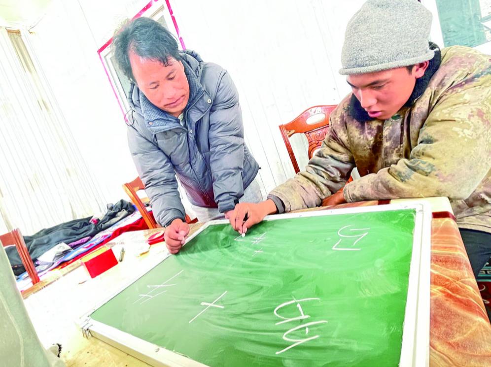 翻越雪山,走過一段泥濘的小路,終于到達了位于甘德縣柯曲鎮德里尖牧委會三社的朝洛同學家中。“朝洛同學好,我們又見面了,上次我教的30個藏文字母你還有印象嗎,讓我們一起來溫習一下。”阿牙老師熟練地拿出教具,朝洛靦腆地笑了笑,隨后坐到老師身旁,跟著老師學習起來。阿牙老師刻意將語速放緩,一遍又一遍念著,直到朝洛基本掌握了字母的發音后,才進行下一個字母的學習。練習完發音后,阿牙老師又在小黑板上一筆一劃教朝洛書寫一些簡單的數字和漢字。