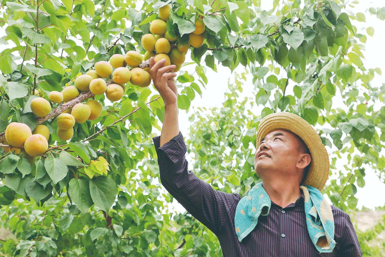 杏林間,一位頭戴草帽、脖頸上搭著毛巾的中年男子正一手提著塑料袋,一手采摘成熟的大黃杏,時不時用毛巾擦拭一下額頭的汗珠。