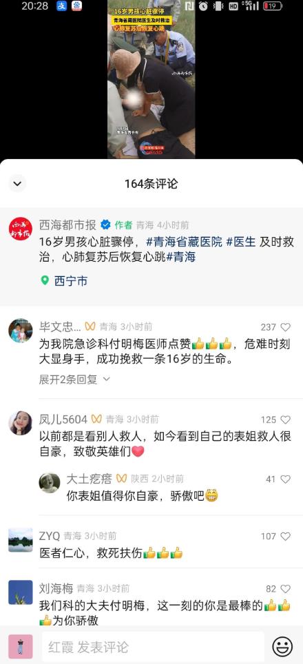 7月17日下午,西海全媒體平臺以短視頻的形式發布了當天緊急救人的畫面,引發眾網友點贊。“以前都是看別人救人,如今看到自己的表姐救人,很自豪,致敬!”“這是救了一個家庭啊,功德無量!”“這就是‘天使’,點贊!”“危難時刻大顯身手,成功挽救了一個16歲的生命。”“還有圍在周圍的警察和武警,為你們點贊!”……