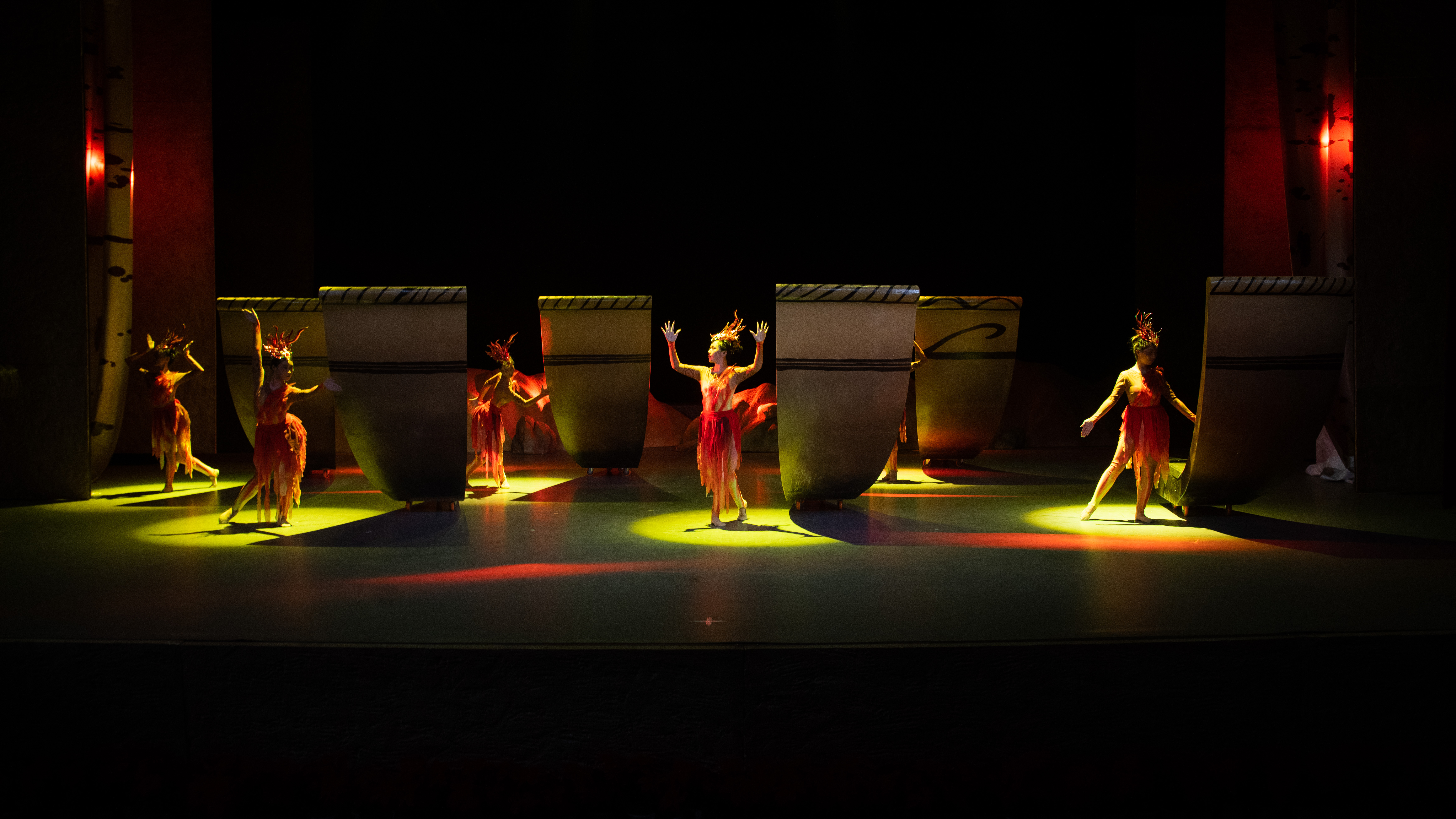 舞蹈詩“活態”還原和再現先民們的生活景象。以彩陶作為情感敘事載體和主題性脈絡進行音樂舞蹈詩的創編和舞蹈動作的設計,以“五人舞蹈紋彩陶盆”舞蹈動作為基礎,以當代舞蹈語言和現代聲光電技術作為藝術表現基礎,結合河湟地方文化特征進行雜糅和拓展,體現新時代西寧文藝的創新實踐,以舞臺展演的形式完成作品的呈現。