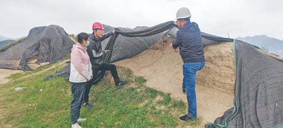 門源古城東城墻保護修繕工程,目前修繕已完成近一半。來到東城墻,新修繕好的小片土墻,覆蓋著一層無紡布。項目總監代表李小合向記者解釋,修繕好的墻面還未干透,不能曝曬只能慢慢陰干。
