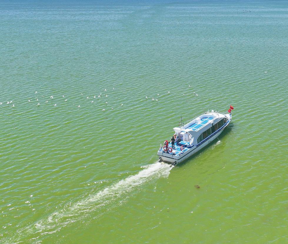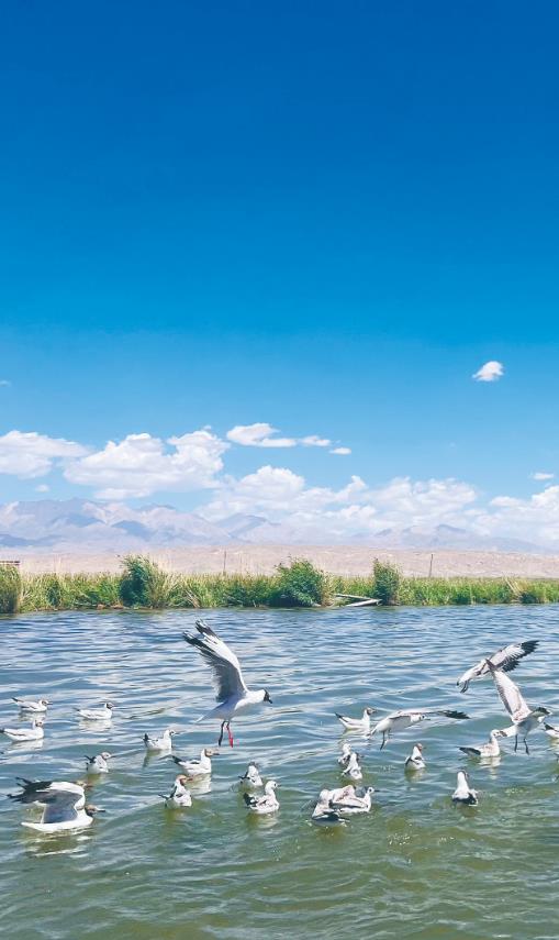 來到可魯克湖旅游景區。水清草茂,景色旖旎,候鳥云集。成群結隊的鳥兒有的悠然靜臥于蘆葦叢中,有的在水面歡快輕盈地翻飛,游客行走在湖畔,與紅嘴鷗親密互動,感受著大自然的神奇魅力。