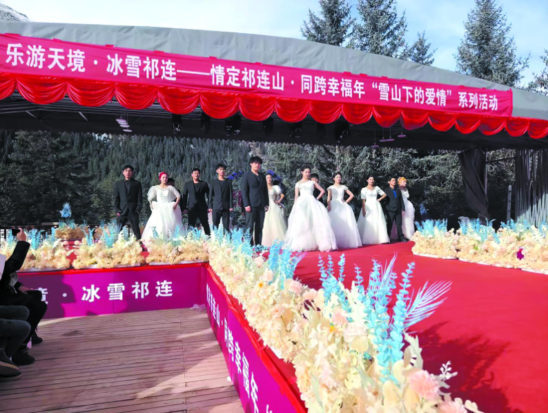 1月1日,新年的第一縷陽光灑向冰雪覆蓋的祁連山,“樂游天境·冰雪祁連”2025年“情定祁連山·同跨幸福年”雪山下的愛情系列活動在海北藏族自治州祁連縣阿咪東索林海浪漫上演。