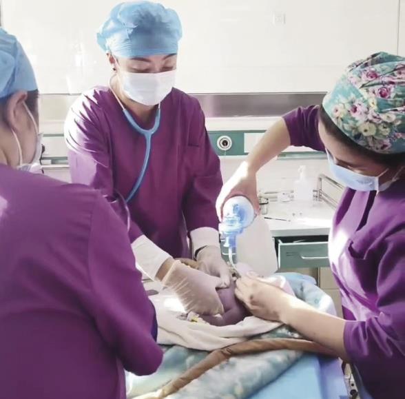 周萬萍(左)正在搶救患兒。圖片由受訪者提供