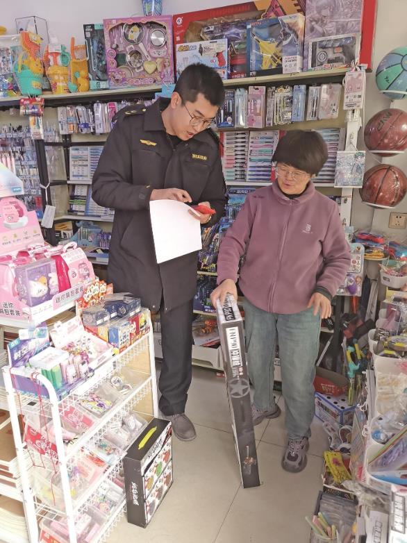2月26日,記者跟隨執法人員前往西寧市一小學附近的文具專營店。檢查中,執法人員著重檢查店鋪是否證照齊全,是否落實進銷貨管理制度,是否銷售“三無”產品、假冒偽劣、過期變質食品,是否經營非法出版物,是否存在銷售玩具槍械、刀具、激光筆等危險暴力玩具和售賣危害學生健康的起泡膠等違法行為。執法人員檢查發現,這家文具專營店不存在以上違法行為。