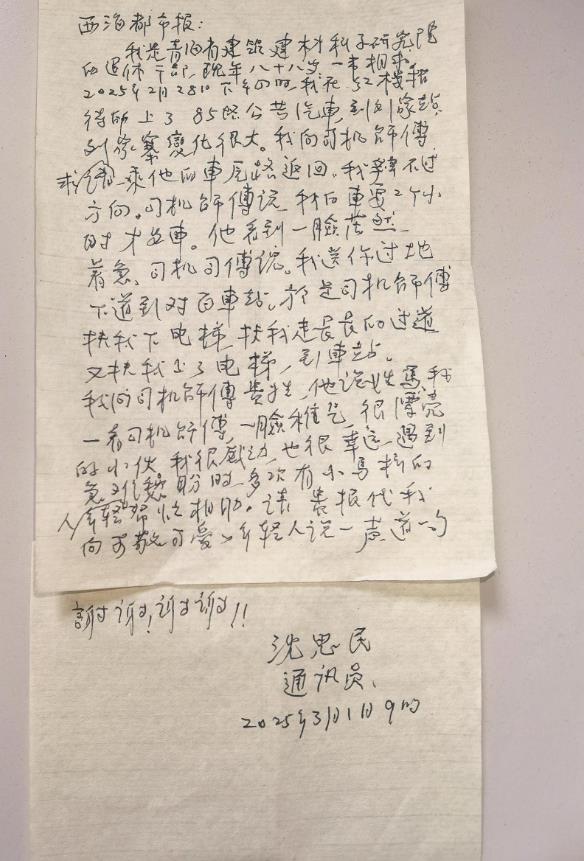“我一個人不敢坐電梯,司機師傅扶我下電梯,扶我走過長長的過道,又扶我上了電梯一直到車站。我很感動也很幸運,能有小馬的幫忙協助。請你們代表我,向可敬可愛的年輕人說一聲、道一句謝謝!”3月3日,沈思民老人將手寫的感謝信送到了西海都市報社。