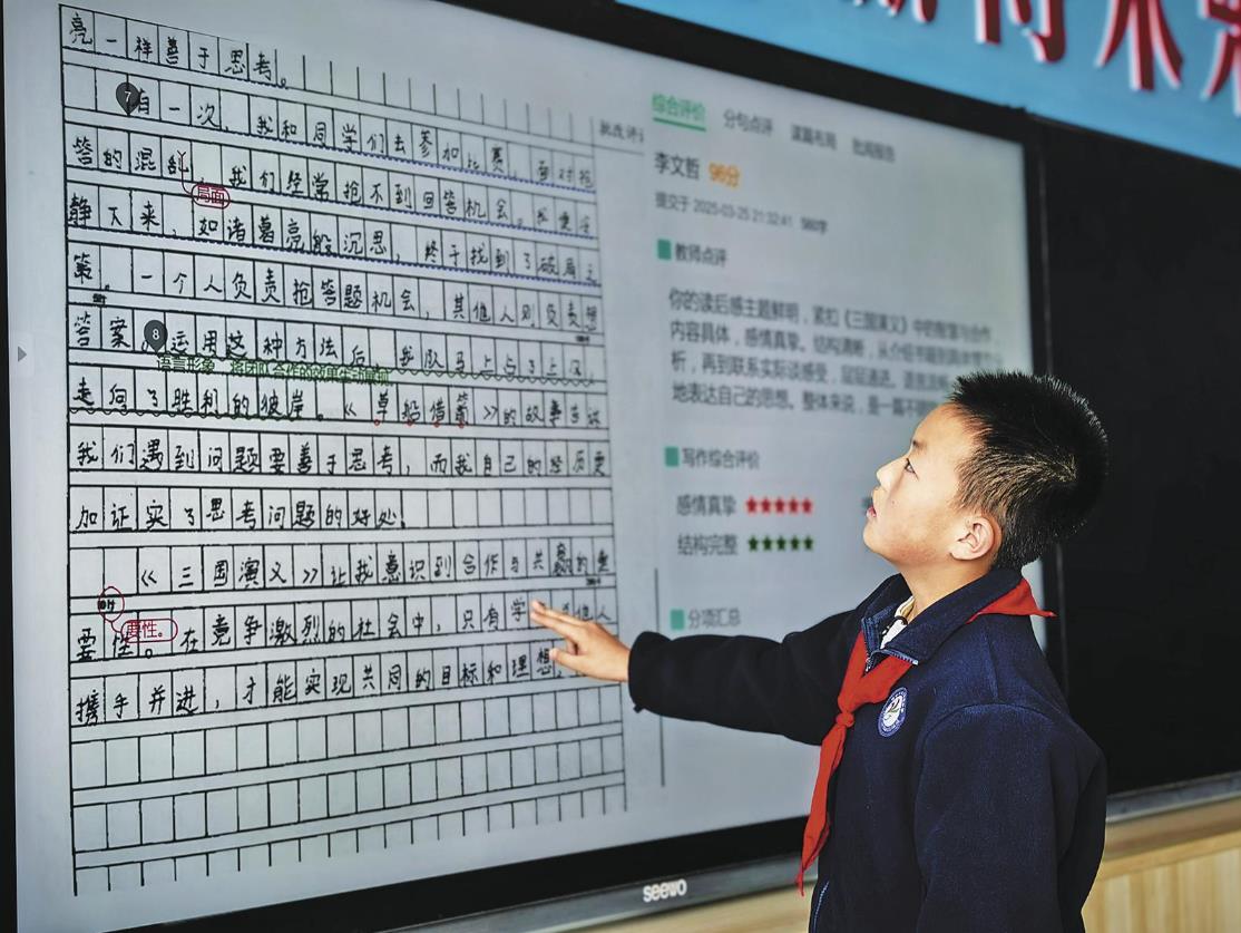 南川西路小學自2024年9月開始進行“AI作文批改”實踐探索,教師的作文批改時間從原來每篇習作每個班兩個星期大幅縮減至半個小時,而且批改維度更為多元、水平更為均衡、評價更為客觀、更具鼓勵性,學生從最初簡單依賴AI評分,逐步學會批判性地審視和選擇性吸收反饋意見。教師在實踐中持續優化AI參數設置,既尊重學生原有寫作風格,又通過縱向追蹤學生成長軌跡動態調整評分標準,形成了“人機協同”的良性互動模式。