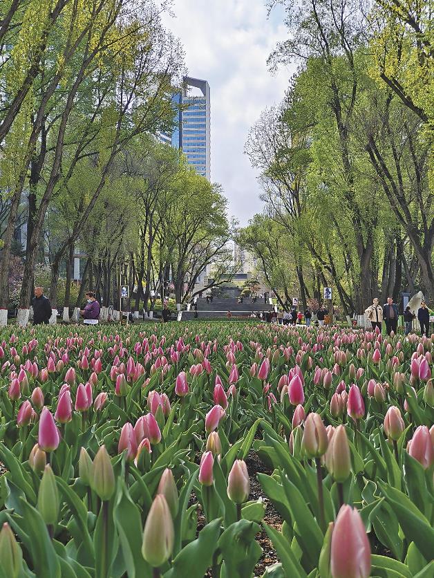 今年,人民公園內(nèi)郁金香種植面積達(dá)6500余平方米,有黃繡球、火鸚鵡、長安美人、粉色印記等34個品種,共計23萬余株,比去年新增8個品種。由于今年春季氣溫較低,郁金香開花稍晚,“五一”前后進(jìn)入盛花期。