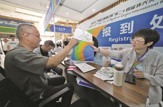當日10時30分,“環青賽”報到處一派繁忙景象。入住辦理、信息核對、服裝單領取、證件和指南領取、餐券領取、外籍駕駛員駕照更換、水壺和補給袋領取7個窗口處,工作人員緊張忙碌,為報到人員提供各項服務。
