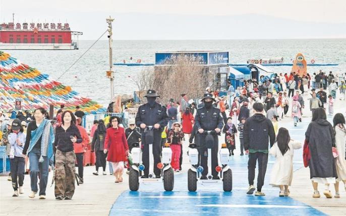 漫步二郎劍半島,人與自然和諧共生的場景隨處可見:游客們輕步靠近水鳥,靜靜觀賞湟魚逆流洄游;騎上牦牛、駱駝與湖景合影,駕駛沙灘摩托在湖畔馳騁,歡聲笑語回蕩在天地間。警用平衡車穿梭人群,以靈活高效的巡邏方式,為景區安全保駕護航。環湖公路上,騎行游客與藍天白云、湖水、自然景觀融為一體,前行的車輪為寧靜的自然景觀帶來動感之美。許多游客也與生態管護員一起參與生態管護,美景珍貴,大家的小舉動讓青海湖更美。