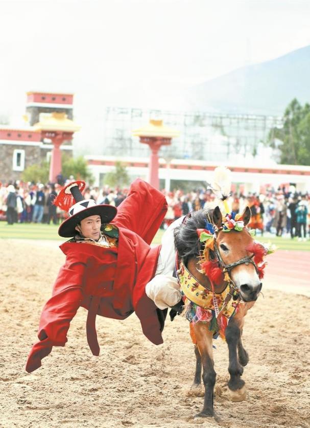 有的騎手身穿輕裝,緊握馬具肚帶,肩靠馬脖,下肢朝天,在馳騁的馬背上穩(wěn)穩(wěn)倒立。有的在奔馳的駿馬上,用腳尖緊鉤馬鐙,全身仰面懸掛于坐騎側(cè)面,頭部幾乎接近地面,場面極為驚險刺激,這些險象環(huán)生的技藝給看臺上的觀眾增添了不少樂趣。來自省城西寧的攝影愛好者李軍說:“賽馬會全方位展示了玉樹社會、經(jīng)濟、文化的繁榮發(fā)展,讓大家感知到康巴文化在當(dāng)代的活態(tài)傳承,確實被驚艷到了,非常震撼。”