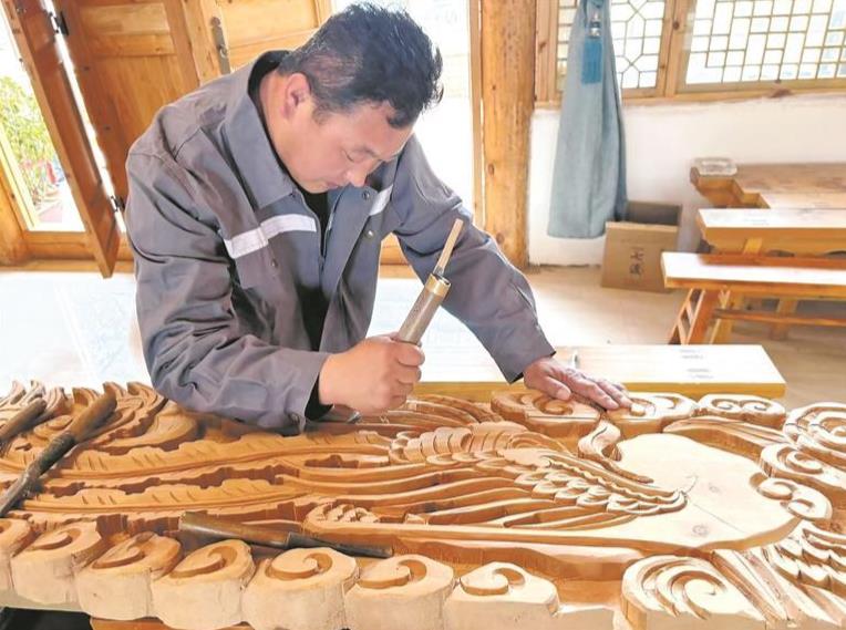 與鏗鏘鐵藝交相輝映的,是木匠手中流動(dòng)的匠心。在木工坊里,刨花如雪紛揚(yáng),墨線清脆彈響,尋常木料被賦予靈性,化作精美家具、雅致擺件、威儀大門。五峰鎮(zhèn)深挖本地豐饒的木材資源,以木藝為犁鏵深耕特色產(chǎn)業(yè)沃土。