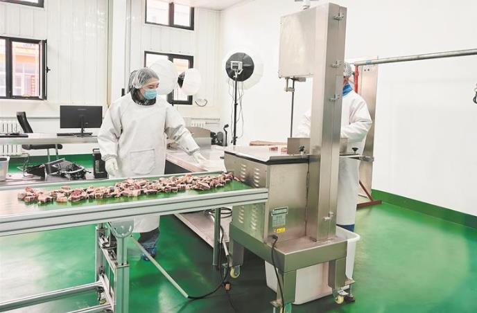 剛察立足資源稟賦,推動畜牧業(yè)由“原”字號向精深加工跨越。在位于剛察縣沙柳河鎮(zhèn)果洛藏貢麻村的海北剛察貢洛農(nóng)畜產(chǎn)品開發(fā)有限責任公司,透過車間玻璃,技術員達日杰忙著在機器前,精細化切割牦牛肉。