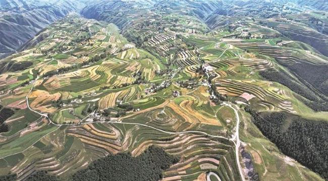 一望無際的田野間,金黃麥浪隨風起伏,與層層疊疊的梯田相映成趣。田野里,收割機往來穿梭,轟鳴聲中成片作物被快速收割脫粒;不遠處的小塊田壟上,鄉親們手持鐮刀,彎腰揮臂收割成熟的麥子——傳統農耕的細致與現代農機的高效交織,勾勒出如詩如畫的豐收圖景。